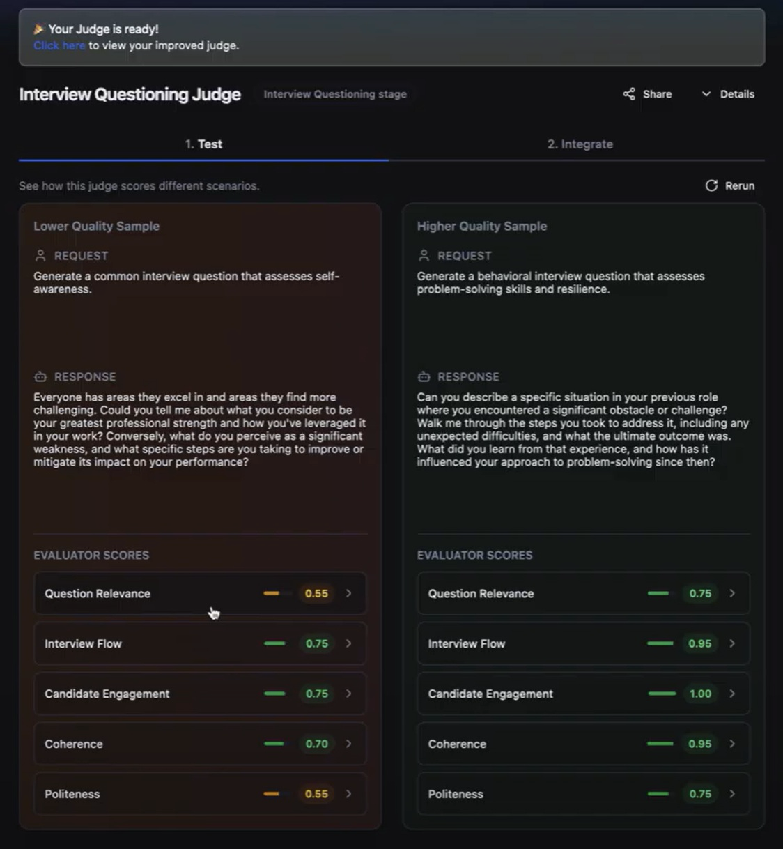 - Automatic improvement: Scorable creates a better version in the background, with more realistic scenarios and a more complete evaluation stack.